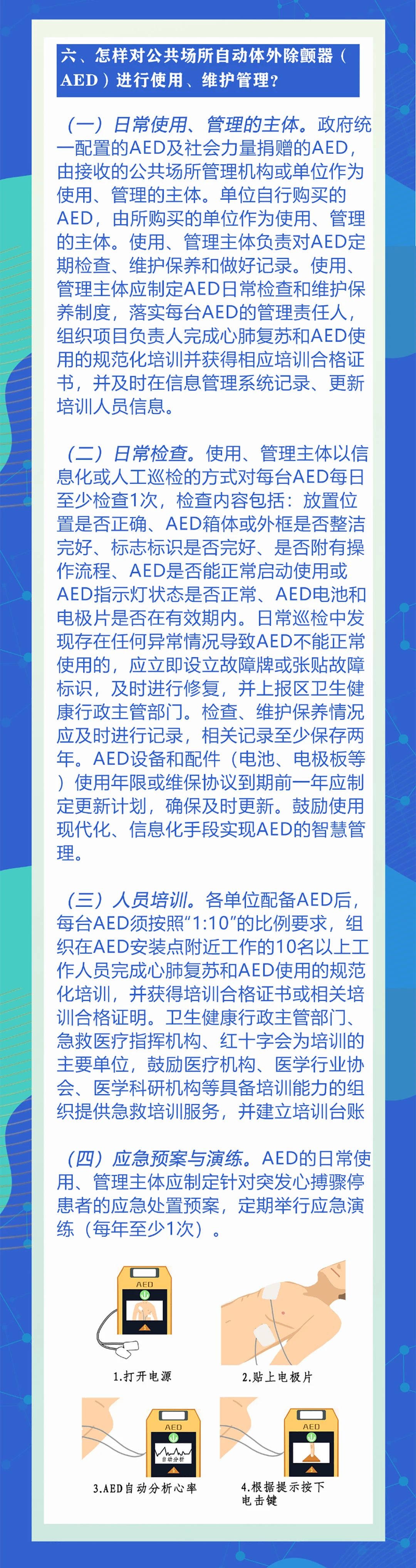 (一)日常使用、管理的主体。政府统一配置的AED及社会力量捐赠的AED,由接收的公共场所管理机构或单位作为使用、管理的主体。单位自行购买的AED,由所购买的单位作为使用、管理的主体。使用、管理主体负责对AED定期检查、维护保养和做好记录。使用、管理主体应制定AED日常检查和维护保养制度,落实每台AED的管理责任人,组织项目负责人完成心肺复苏和AED使用的规范化培训并获得相应培训合格证书,并及时在信息管理系统记录、更新培训人员信息。