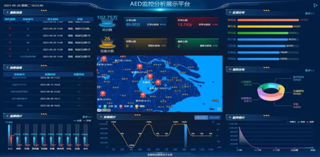 该平台基于“物联网+大安全”技术架构,深度融合了云计算、大数据、人工智能等高新技术,集AED管理平台、志愿者管理平台、核心数据交换中心(包括一键呼救、设备配置、110 / 120联动、AED地图、急救宣传培训、动态急救网等功能)为一体。